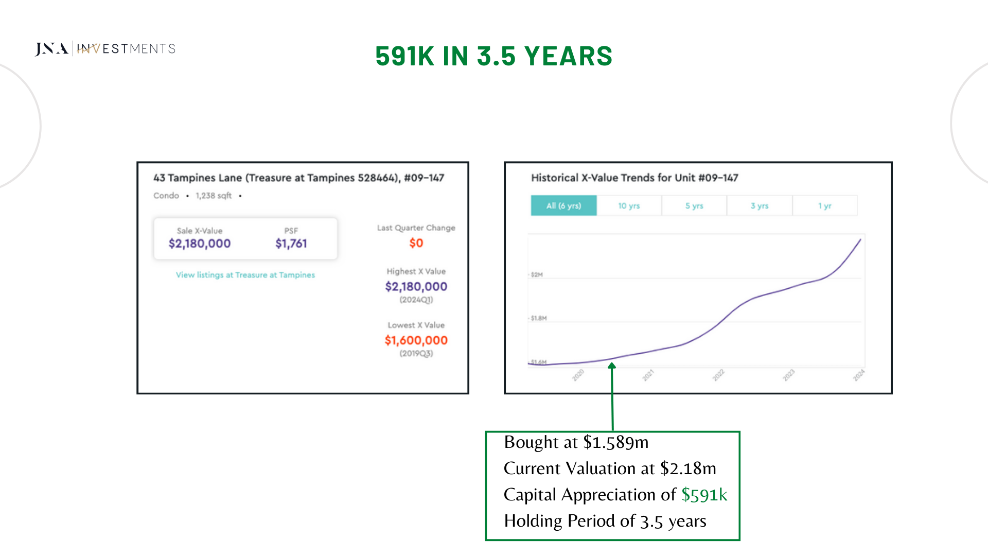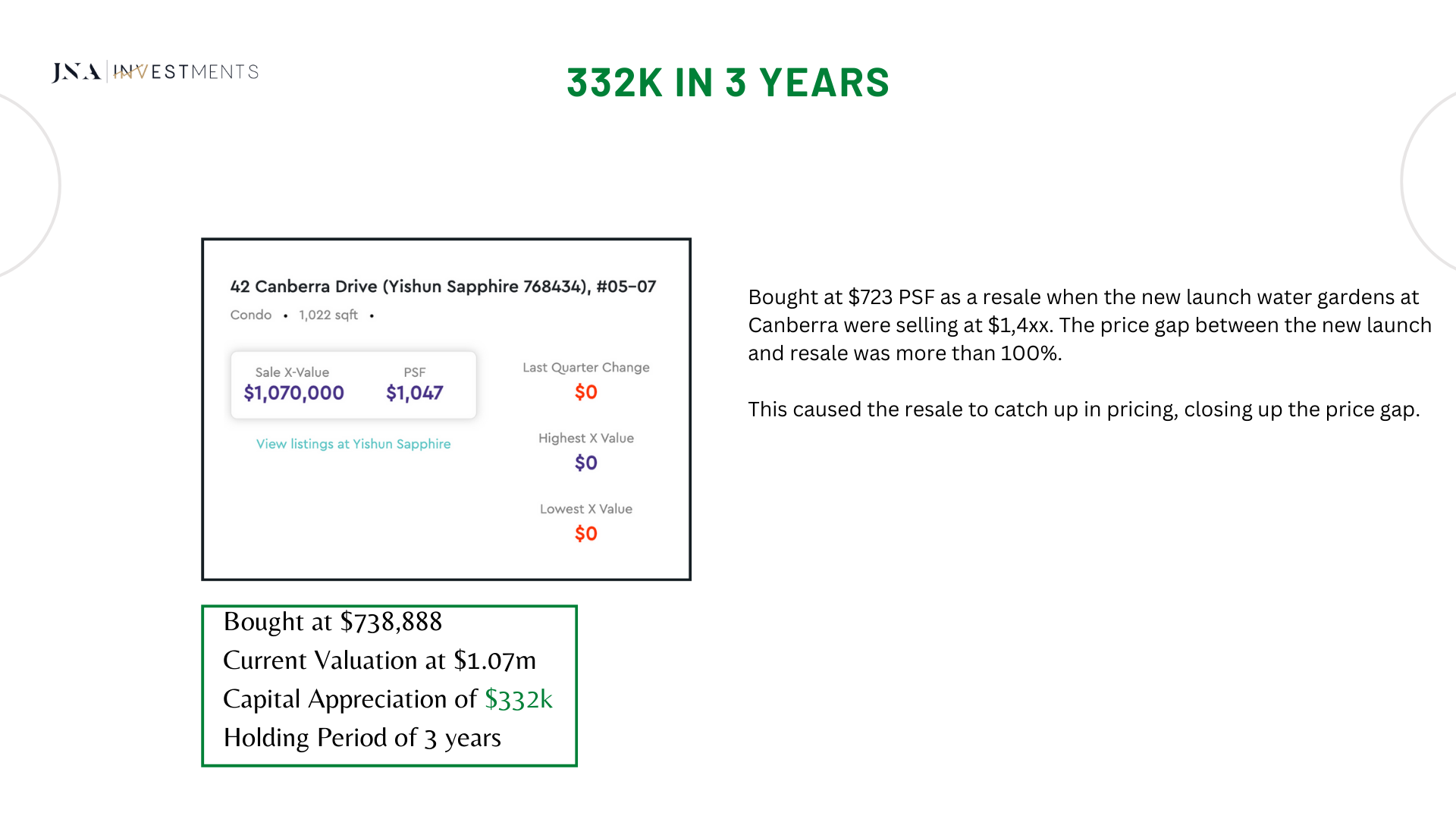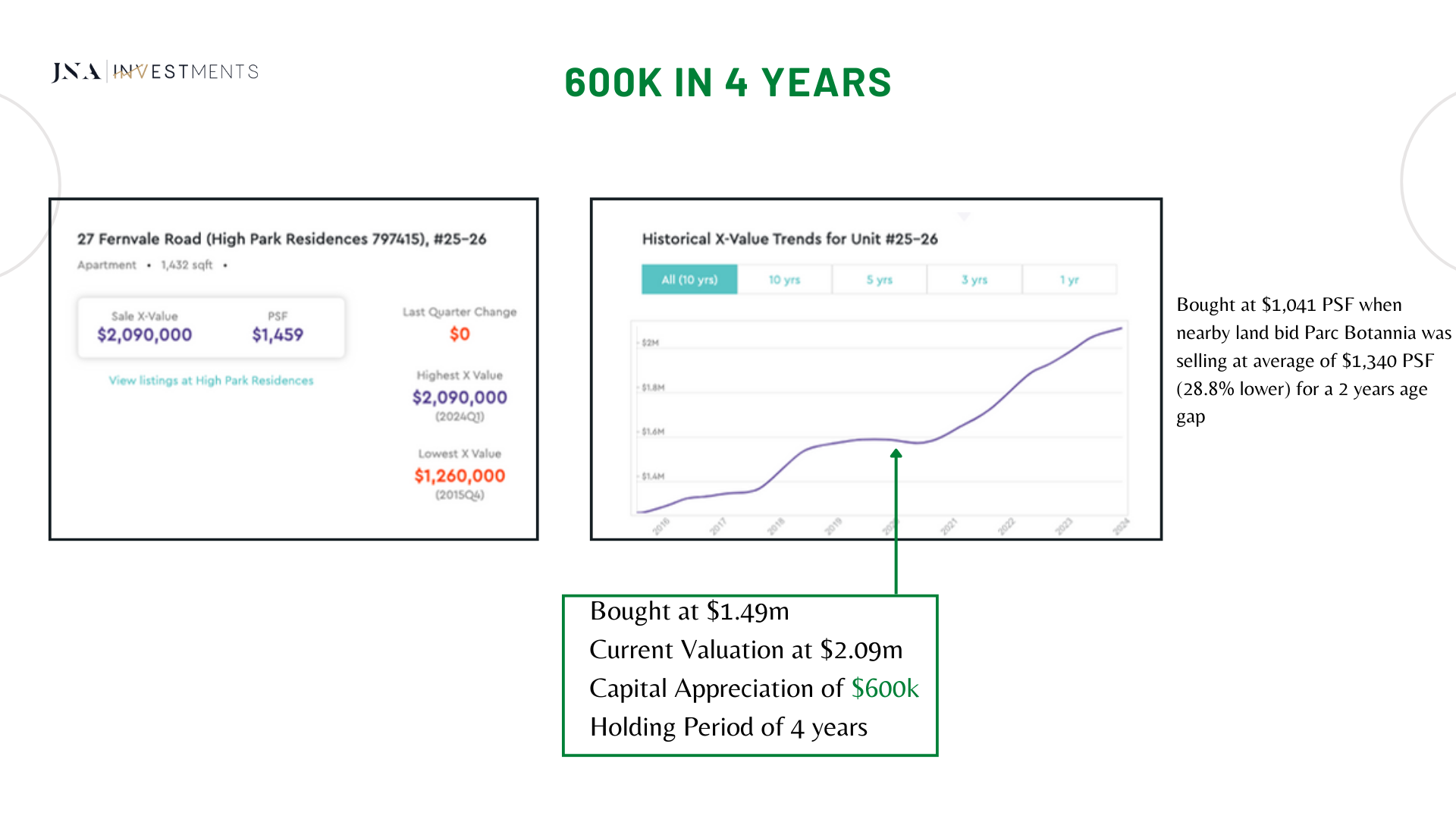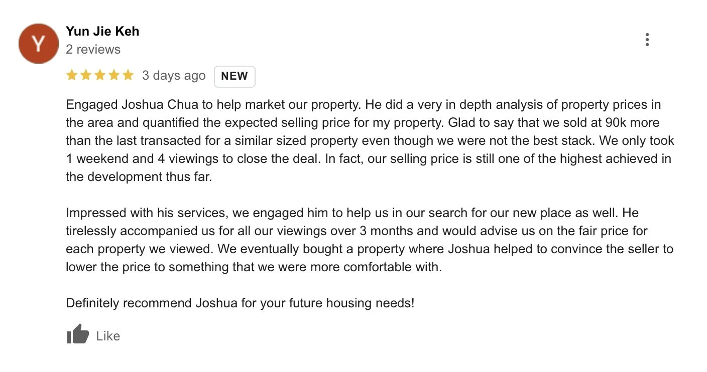 I am also a property investor, using the exact same strategies that I have implemented for my clients on their investments, I had purchased a 3-bedroom condominium at Normanton Park. Till date, my investment purchase has yielded capital gains of close to $400,000 in 3 years (approximately 23.15% p.a. returns).